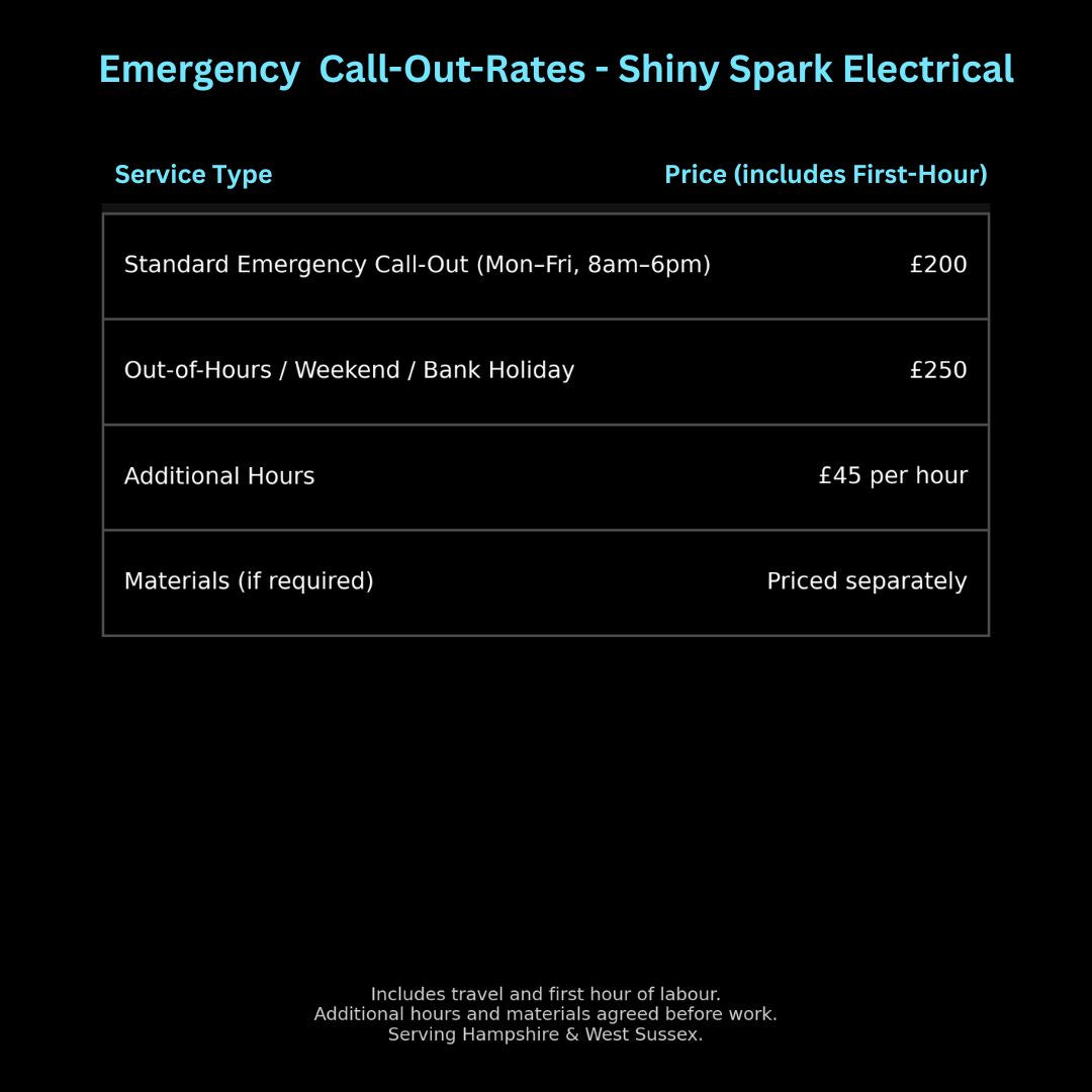 At Shiny Spark Electrical, we offer a rapid response service covering Hampshire and West Sussex — ensuring your home or business is safe and powered again quickly.